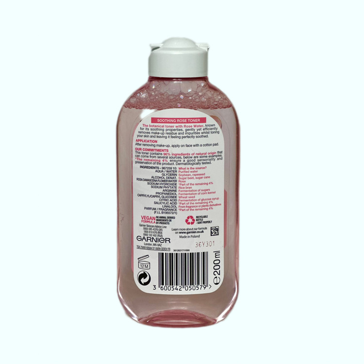تونر گارنیر صورتی بخاطر داشتن عصاره گل رز از خواص تسکین دهندهخوبی بهره مند است و می تواند به طور مطلوبی پوست را مرطوب کند و از التهابات پوست بکاهد.