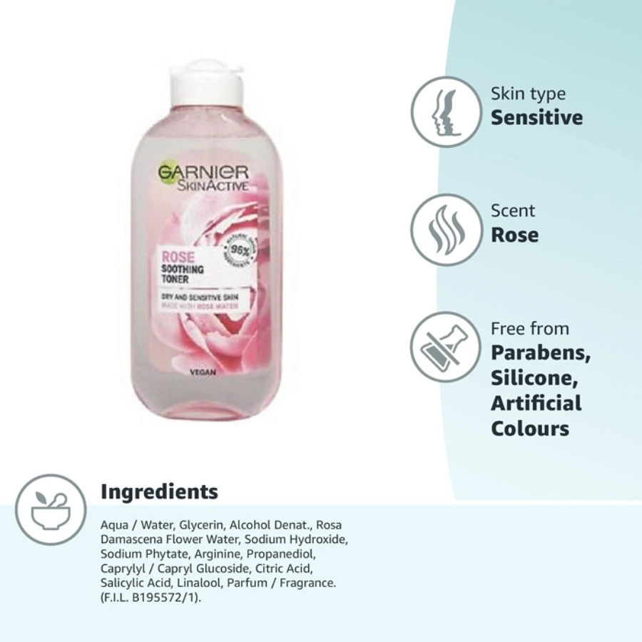 تونر گارنیر صورتی بخاطر داشتن عصاره گل رز از خواص تسکین دهندهخوبی بهره مند است و می تواند به طور مطلوبی پوست را مرطوب کند و از التهابات پوست بکاهد.